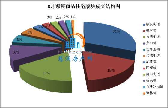 8月慈溪商品住宅版块成交中,城区楼盘(浒山街道、古塘街道、白沙路街道、坎墩街道、宗汉街道)成交243套,成交均价9591.42元/㎡。宗汉街道成交130套,占当月全市总成交量31%;横河镇成交备案76套,占当月全市总成交量18%;古塘街道成交备案74套,占当月全市总成交量17%。
