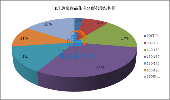 8月慈溪商品住宅分面积段成交中,130-150㎡面积段产品成交130套,成交均价7661.84元/㎡,占总成交套数的31%,销量排名第一;110-130㎡面积段产品成交72套,成交均价7575.18元/㎡,占总成交套数的17%,销量排名第二;190㎡以上面积段产品成交67套,成交均价11865.84元/㎡,占总成交套数的16%,销量排名第三。