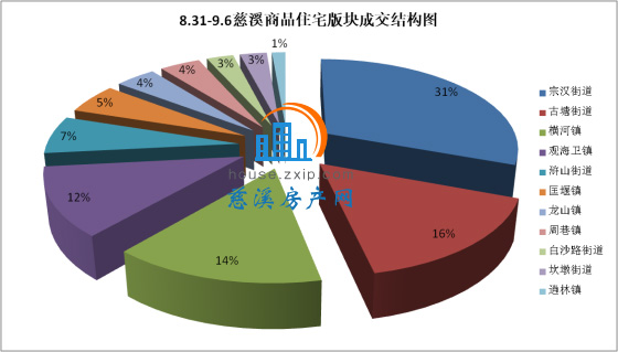 慈溪商品住宅(含别墅)各版块成交情况中,城区版块(浒山街道、古塘街道、白沙路街道、宗汉街道、坎墩街道)共成交44套,成交均价9712.56元/㎡。排名前三版块:宗汉街道备案23套,占31%;古塘街道备案12套,占16%;横河镇备案11套,占14%。