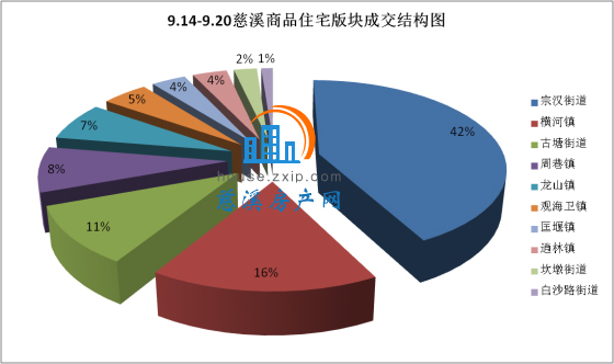 慈溪商品住宅(含别墅)各版块成交情况中,城区版块(浒山街道、古塘街道、白沙路街道、宗汉街道、坎墩街道)共成交48套,成交均价9295.91元/㎡。排名前三版块:宗汉街道备案36套,占42%;横河镇备案14套,占16%;古塘街道备案9套,占11%。