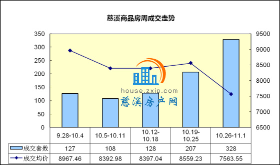 上周(10.26-11.1)成交各类房源(含住宅、公寓、商铺、写字楼和车库)共计328套,成交均价7563.55元/㎡,成交面积34018.18方。环比上上周成交量上涨58.45%,成交均价下降11.63%,成交面积上涨66.46%。