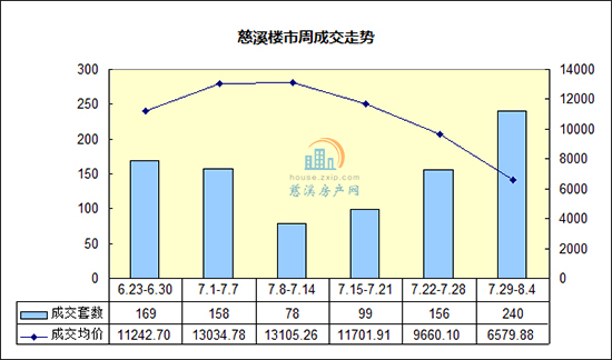 慈溪上周(7.29-8.4)成交各类房源(含住宅、公寓、商铺、写字楼和车库)共计240套,环比上上周增加53.85%,成交均价6579.88元/㎡,环比上上周下跌31.89%。