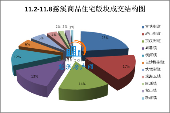 慈溪商品住宅(含别墅)各版块成交情况中,城区版块(浒山街道、古塘街道、白沙路街道、宗汉街道、坎墩街道)共成交69套,成交均价11183.23元/㎡。排名前三版块:古塘街道备案24套,占上周商品住宅成交总量23%;浒山街道备案18套,占上周商品住宅成交总量的17%;宗汉街道备案15套,占上周商品住宅成交总量14%。