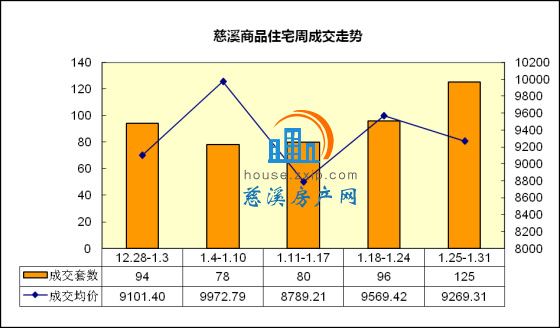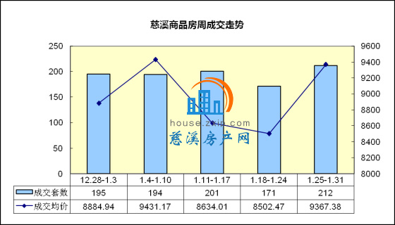 上周(1.25-1.31)成交各类房源(含住宅、公寓、商铺、写字楼和车库)共计212套,成交均价9367.38元/㎡,成交面积24750.57方。环比上上周成交量上升23.98%,成交均价上升10.17%,成交面积上升4.06%。