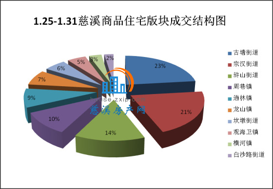 慈溪商品住宅(含别墅)各版块成交情况中,城区版块(浒山街道、古塘街道、白沙路街道、宗汉街道、坎墩街道)共成交82套,成交均价10837.22元/㎡。排名前三版块:古塘街道备案29套,占上周商品住宅成交总量23%;宗汉街道备案26套,占上周商品住宅成交总量的21%;浒山街道备案17套,占上周商品住宅成交总量14%
