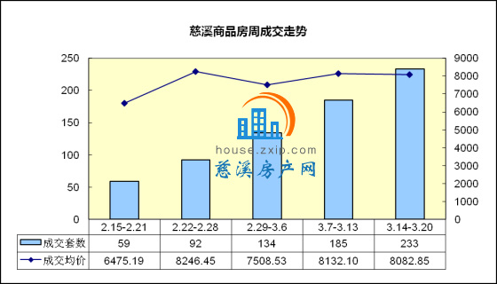 上周(3.14-3.20)成交各类房源(含住宅、公寓、商铺、写字楼和车库)共计233套,成交均价8082.85元/㎡,成交面积24371.2方。环比上上周成交量上升25.95%,成交均价下降0.61%,成交面积上升29.65%。
