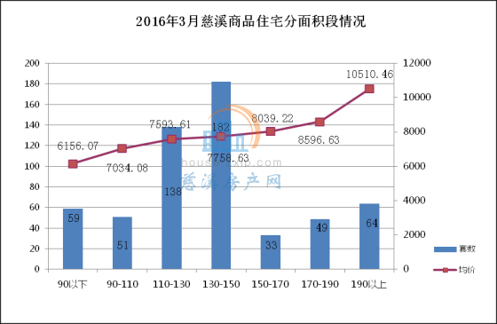 3月慈溪商品住宅按面积段成交中,130-150㎡面积段产品成交182套,成交均价7758.63元/㎡,占总成交套数的32%,销量排名第一;110-130㎡面积段产品成交138套,成交均价7593.61元/㎡,占总成交套数的24%,销量排名第二;190㎡以上面积段产品成交64套,成交均价10510.46元/㎡,占总成交套数的11%,销量排名第三。