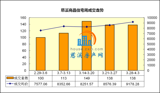 上周(3.28-4.3)成交各类房源(含住宅、公寓、商铺、写字楼和车库)共计220套,成交均价9076.11元/㎡,成交面积21918.12方。环比上上周成交量上升9.45%,成交均价上升6.42%,成交面下降7.22%。