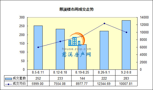 慈溪上周(9.2-9.8)成交各类房源(含住宅、公寓、商铺、写字楼和车库)共计283套,环比上涨27.5%,成交均价10007.81元/㎡,环比上上周略有下降。