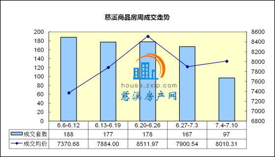 上周(7.4-7.10)成交各类房源(含住宅、公寓、商铺、写字楼和车库)共计97套,成交均价8010.31元/㎡,成交面积12755.1方。环比上上周成交量下跌42%,成交均价上升1.39%,成交面积下跌49.42%。