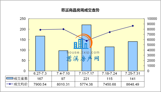 上周(7.25-7.31)成交各类房源(含住宅、公寓、商铺、写字楼和车库)共计141套,成交均价8648.49元/㎡,成交面积15802方。环比上上周成交量上涨22.61%,成交均价上涨16.08%,成交面积上涨12.39%。(注:星海湾、双囍花园未纳入统计)