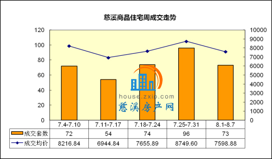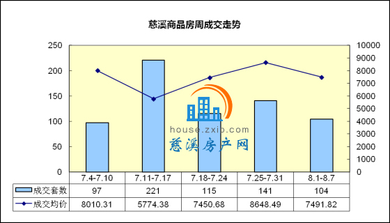 上周(8.1-8.7)成交各类房源(含住宅、公寓、商铺、写字楼和车库)共计104套,成交均价7491.82元/㎡,成交面积12306.31方。环比上上周成交量下跌26.24%,成交均价下跌13.37%,成交面积下跌22.12%。(注:双囍花园未纳入统计)