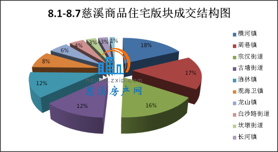 慈溪商品住宅(含别墅)各版块成交情况中,城区版块(浒山街道、古塘街道、白沙路街道、宗汉街道、坎墩街道)共成交27套,成交均价9642.06元/㎡。排名前三版块:横河镇备案13套,占上周商品住宅成交总量的18%;周巷镇和宗汉街道备案12套,占上周商品住宅成交总量的17%;古塘街道和逍林镇备案9套,占上周商品住宅成交总量的12%