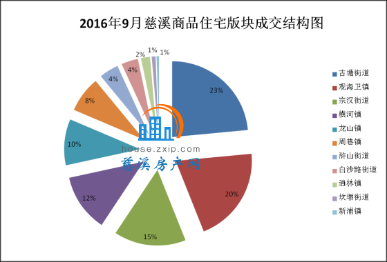 9月慈溪商品住宅版块成交中,城区楼盘(浒山街道、古塘街道、白沙路街道、坎墩街道、宗汉街道)成交173套,成交均价9584.78元/㎡。古塘街道成交备案86套,占当月全市总成交量23%;观海卫镇成交备案76套,占当月全市总成交量20%;宗汉街道成交备案56套,占当月全市总成交量15%。