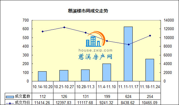 慈溪上周(11.18-11.24)成交各类房源(含住宅、公寓、商铺、写字楼和车库)共计254套(包含人才公寓星光家园95套),成交均价10465.09元/。环比上上周成交量下降59.29%,成交均价提高24.01%。