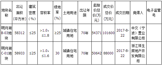 慈溪市国土资源局于201年8月22日举行明月湖B-03、C-01地块国有建设用地使用权拍卖出让活动。现拍卖出让活动结束,将出让结果公布如下: