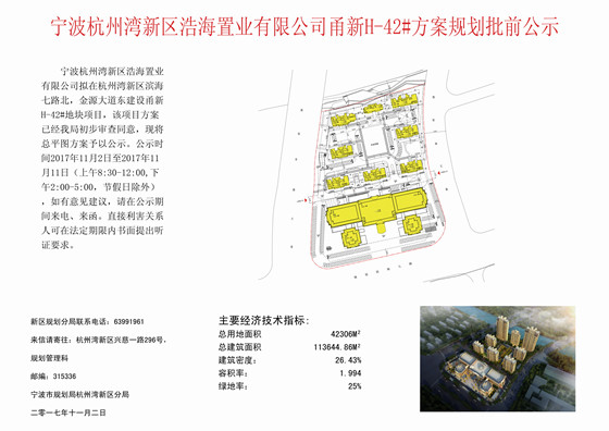 宁波杭州湾新区浩海置业有限公司拟在杭州湾新区滨海七路北,金源大道东建设甬新H-42#项目,现将该项目总平面方案予以公示。公示时间自2017年11月2日起十日内,如对方案有意见、建议,请在公示期间来电或来信到杭州湾新区规划分局,直接利害关系人可在法定期限内书面提出听证要求。规划分局联系电话:63991961、63991956(上午8:30-12:00,下午2:00-5:00,节假日除外),来信请寄:宁波杭州湾新区兴慈一路296号新区行政服务中心规划窗口,邮编:315336。
