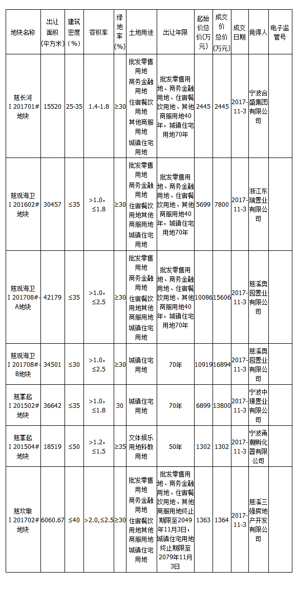 慈溪市国土资源局于2017年10月23日至2017年11月3日举行慈长河Ⅰ201701#地块、慈观海卫Ⅰ201602#地块、慈观海卫Ⅰ201708#-A地块、慈观海卫Ⅰ201708#-B地块、慈掌起Ⅰ201502#地块、慈掌起Ⅰ201504#地块、慈坎墩I201702#地块国有建设用地使用权挂牌出让活动。现挂牌出让活动结束,将出让结果公布如下: