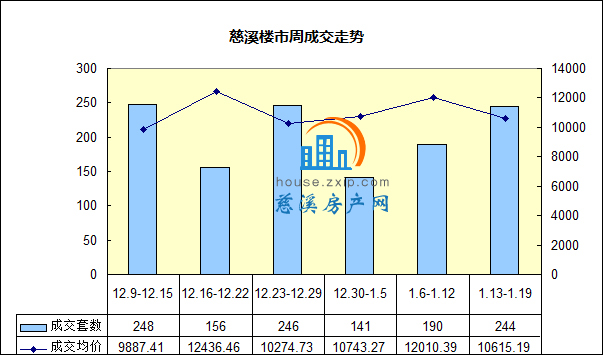 慈溪上周(1.13-1.19)成交各类房源(含住宅、公寓、商铺、写字楼和车库)共计244套(包含人才公寓星光家园36套),成交均价10615.19元/㎡。环比上上周成交量提高28.42%,成交均价下降11.62%