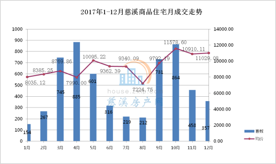 12月慈溪商品住宅共成交357套,其中高层328套,成交均价10992.26元/㎡;别墅29套,成交均价11195.19元/㎡。
