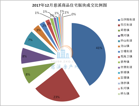 12月慈溪商品住宅版块成交中,城区楼盘(浒山街道、古塘街道、白沙路街道、坎墩街道、宗汉街道)成交268套,成交均价12367.54元/㎡。白沙路街道成交备案147套,占当月全市总成交量41%;宗汉街道成交备案83套,占当月全市总成交量23%;周巷镇成交备案29套,占当月全市总成交量8%。