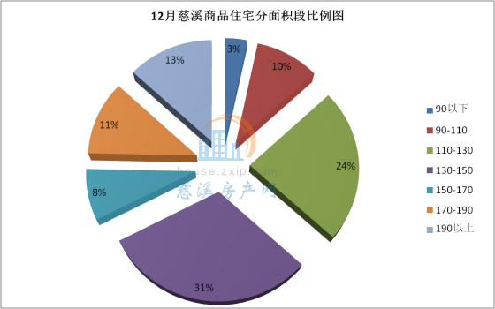 12月慈溪商品住宅按面积段成交中,130㎡-150㎡面积段产品成交110套,占总成交套数的31%,销量排名第一;110㎡-130㎡面积段产品成交84套,占总成交套数的24%,销量排名第二;190㎡以上面积段产品成交47套,占总成交套数的13%,销量排名第三。