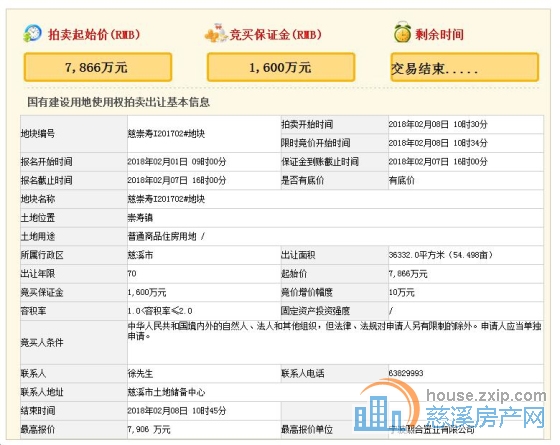 经过5轮竞拍,最终碧桂园以总价7906万元竞得慈崇寿I201702#地块,溢价率0.5%,成交楼面价1088元/平方米。