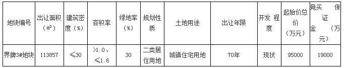 二、出让地块的规划指标、土地用途、出让年限、起始价总价及竞买保证金等如下: