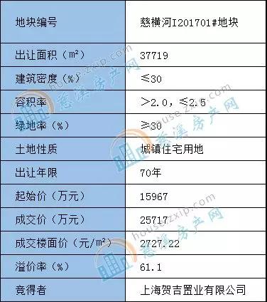 第三块值得一提的是慈横河I201701#地块,该地块位于横河镇,东至规划绿化带、南至东上河村宅基地及道路、西至规划翠屏路、北至横彭公路。总出让面积为37719㎡(约56.579亩),经过236轮激烈竞价,最终 由上海贺吉置业有限公司(上坤置业),以楼面价2727.22元/㎡,总成交金额25717万元竞得。