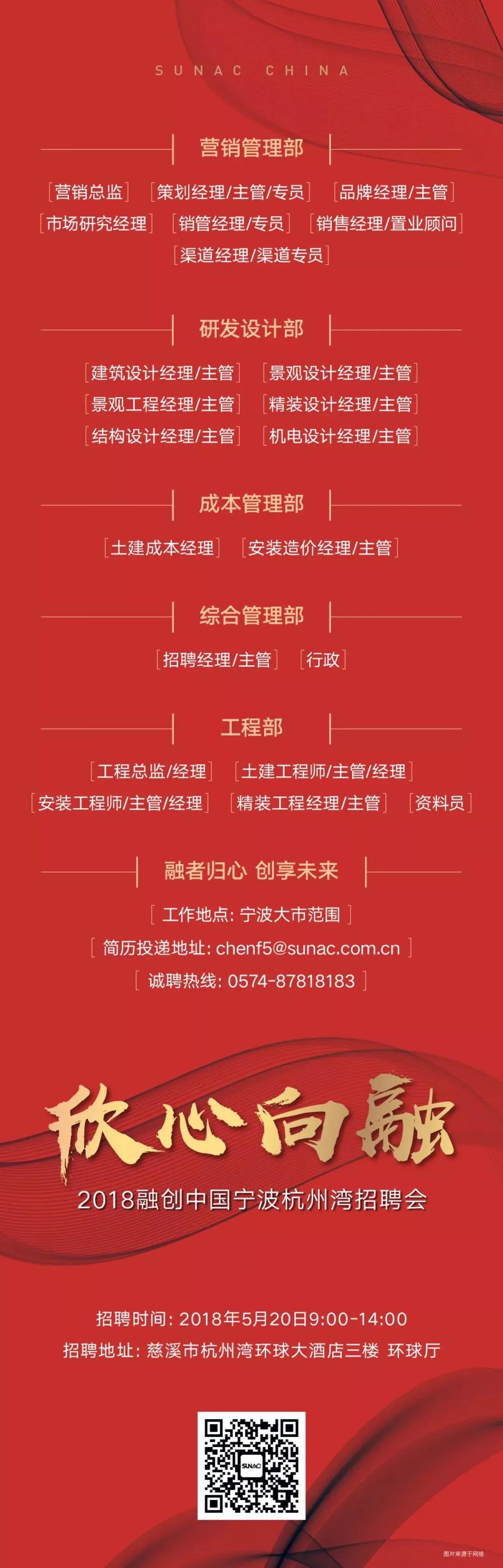 2018融创中国宁波杭州湾招聘会将于5月20日(9:00至14:00)在慈溪杭州湾环球大酒店三楼环球厅盛大举行,招聘岗位包含营销、研发、设计、工程、行政、人力等,全盘组建项目运作团队。