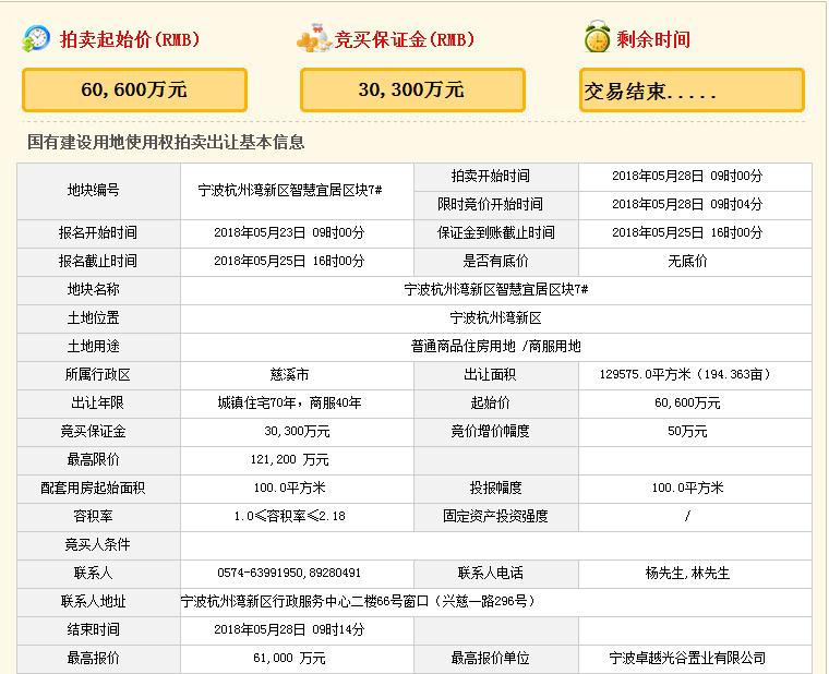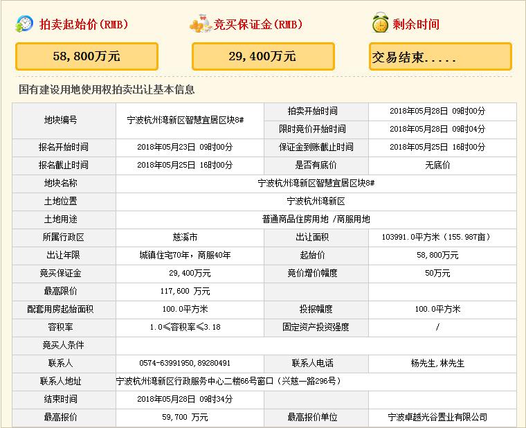 地块在2018年5月28日上午9点开拍,最终卓越分别以总价61000万元,楼面价2159.49元/㎡;总价59700万元,楼面价1805元/㎡;总价47450万元,楼面价2343.88元/㎡竞得杭州湾3宗地块。