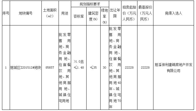 慈城区1宗商住混合用地拍卖竞价结果