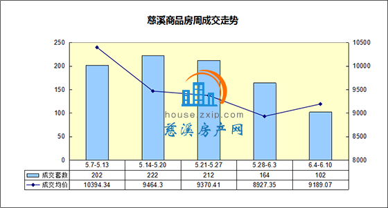 上周(6.4-6.10)成交各类房源(含住宅、公寓、商铺、写字楼和车库)共计102套,成交均价9189.07元/㎡,成交面积14141.26方。环比上上周成交量下跌37.80%,成交均价上涨2.93%。