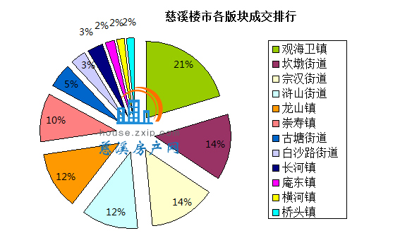 慈溪各版块各类房源成交情况中,观海卫镇12套,占21%;坎墩街道8套,占14%;宗汉街道8套,占14%。