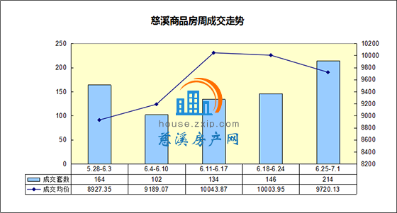 上周(6.25-7.1)成交各类房源(含住宅、公寓、商铺、写字楼和车库)共计214套,成交均价9720.13元/㎡,成交面积14299.05方。环比上上周成交量上涨46.58%,成交均价下跌2.84%。