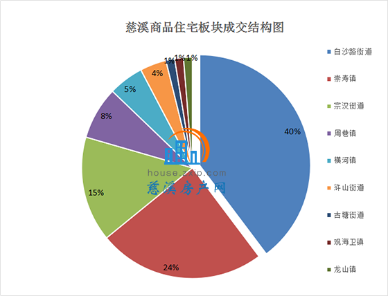 慈溪商品住宅(含别墅)各版块成交情况中,城区版块(浒山街道、古塘街道、白沙路街道、宗汉街道、坎墩街道)共成交48套,成交均价13297.03元/㎡。排名前三版块:白沙路街道备案31套,占上周商品住宅成交总量的40%;崇寿镇备案19套,占上周商品住宅成交总量的24%;宗汉街道备案12套,占上周商品住宅成交总量的15%。