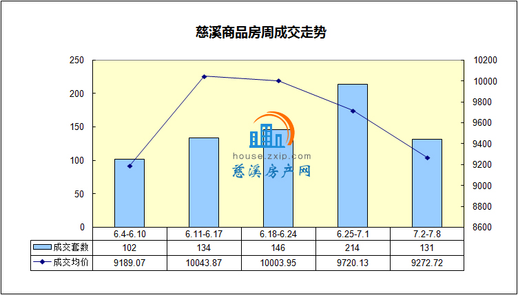 上周(7.2-7.8)成交各类房源(含住宅、公寓、商铺、写字楼和车库)共计131套,成交均价9272.72元/㎡,成交面积12295方。环比上上周成交量下跌38.79%,成交均价下跌4.6%。