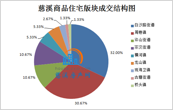 慈溪商品住宅(含别墅)各版块成交情况中,城区版块(浒山街道、古塘街道、白沙路街道、宗汉街道、坎墩街道)共成交41套,成交均价11634.68元/㎡。排名前三版块:白沙路街道备案24套,占上周商品住宅成交总量的32%;周巷镇备案23套,占上周商品住宅成交总量的30.67%;浒山街道、宗汉街道上周均备案8套,占上周商品住宅成交总量的10.67%。