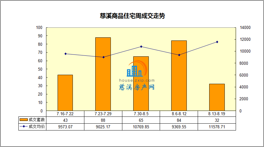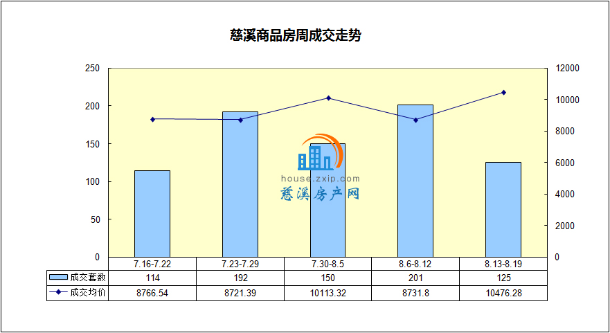 上周(8.13-8.19)成交各类房源(含住宅、公寓、商铺、写字楼和车库)共计125套,成交均价10476.28元/㎡,成交面积7971.12方。环比上上周成交量下跌37.8%,成交均价上涨19.98%。
