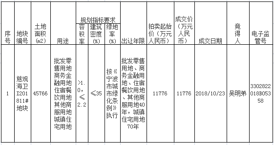 慈溪市国土资源局于2018年10月23日对位于观海卫镇的一宗国有建设用地使用权通过浙江省土地使用权网上交易系统进行拍卖出让。现将出让结果公布如下: |