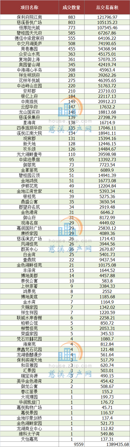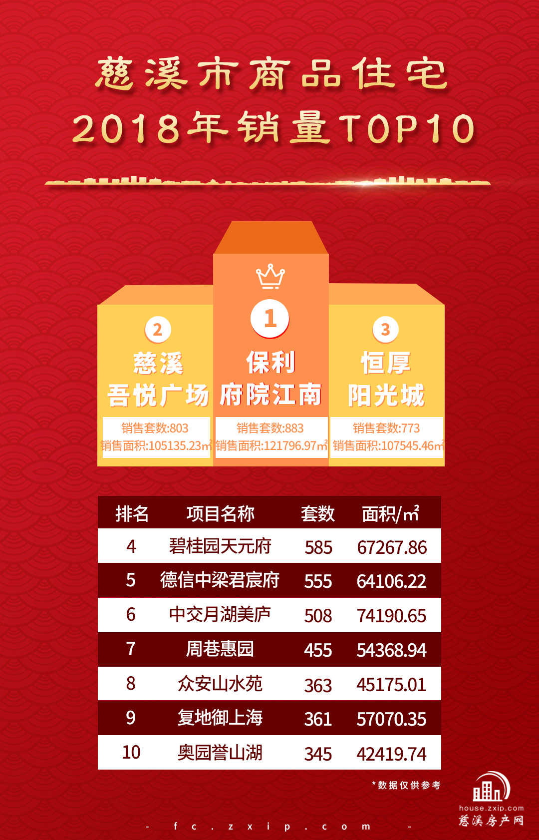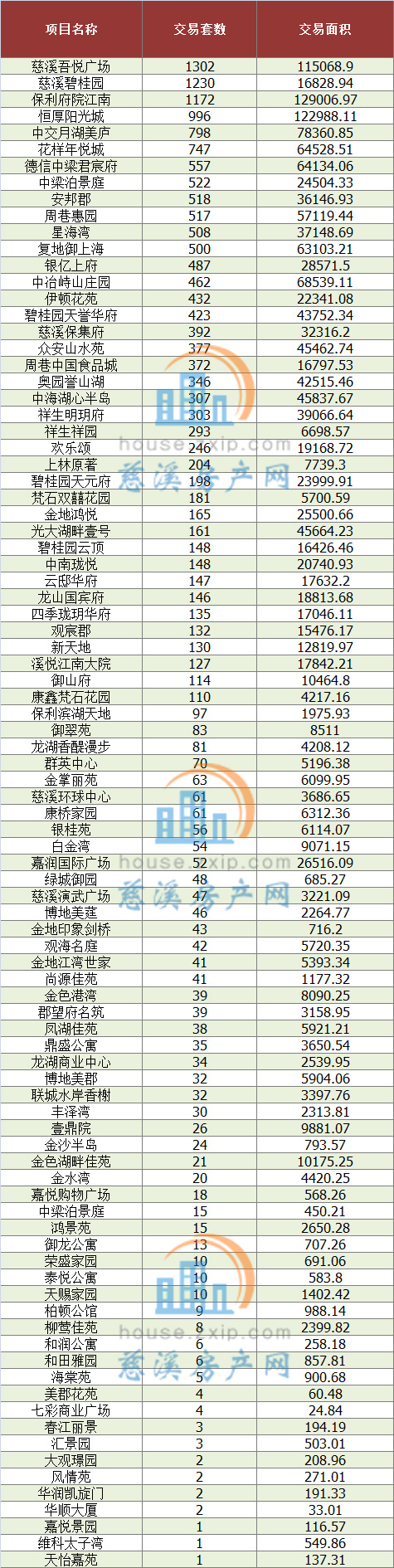 从成交排行榜上看,保利府院江南以883套的成交量领跑慈溪楼市摘得冠军宝座;而紧随其后的则是今年势头火热的新城吾悦广场,以803的成交量位居第二,而第三名则是由成交773套的元亨雅园夺下。