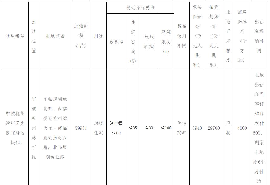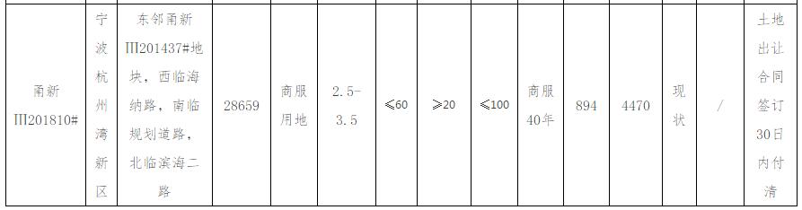 宁波杭州湾新区文游宜居区块4#;宁波杭州湾新区康乐宜居区块5#地块竞得人自《国有建设用地使用权出让合同》签订之日起30日内支付50%出让价款,180日内付清剩余价款;甬新Ⅲ201810#地块竞得人自《国有建设用地使用权出让合同》签订之日起30日内付清。