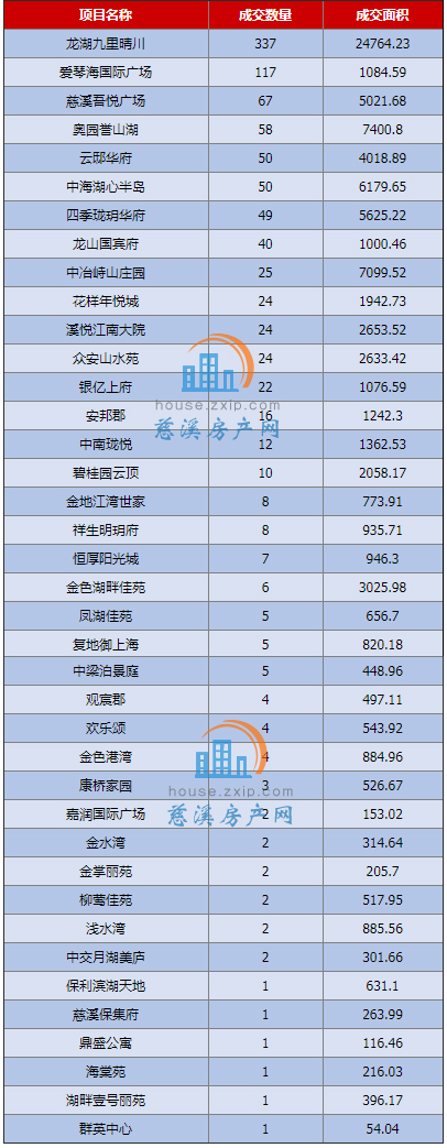 从成交排行榜上看,位于龙山镇的龙湖九里晴川以337套的成交量夺得1月份慈溪商品住宅交易套排行的冠军宝座,领跑慈溪楼市,而爱琴海国际广场以117套的成交量居于亚军位置。紧接着是去年火热的悦华府,以67套住宅成交量跻身前三甲。
