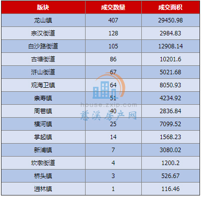 从成交区域上来看,龙山镇以月成交407套居于榜首,成交主要来自于龙湖九里晴川及龙瑞华府两个项目,其次为宗汉街道与白沙路街道。