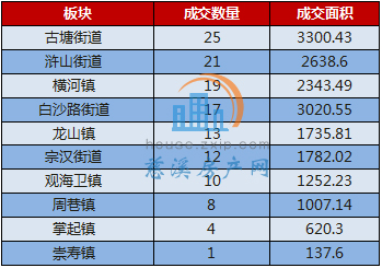 从成交区域上来看,古塘街道以月成交25套居于榜首,成交主要来自于溪悦溪悦江南大院及四季珑玥华府两个项目,其次为浒山街道与横河镇。
