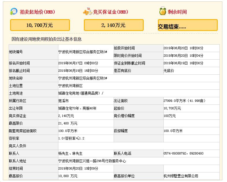 经过2轮竞拍,由杭州绿墅置业有限公司(绿地)以总价10800万元,楼面价3214元/㎡,溢价率0.9%竞得该地块。