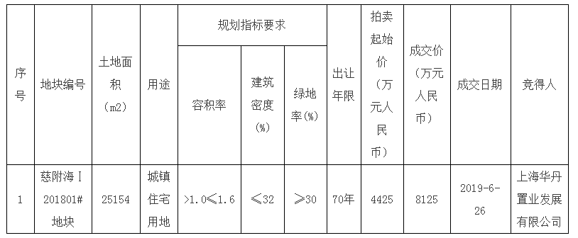 慈溪市国有建设用地使用权拍卖竞价结果(编号:CXGTCR2019023)