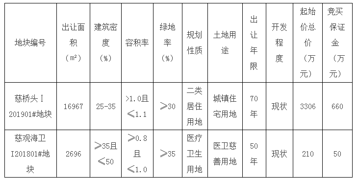 二、出让地块的规划指标、土地用途、出让年限、起始价总价及竞买保证金等如下: