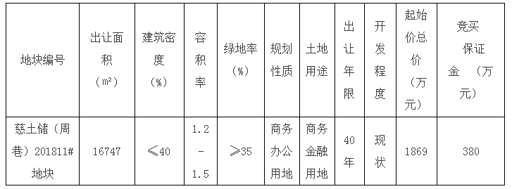 二、出让地块的规划指标、土地用途、出让年限、起始价总价及竞买保证金等如下: