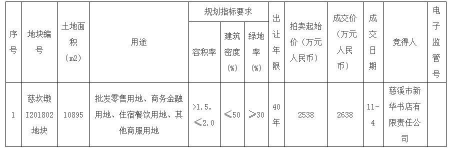 慈溪市自然资源和规划局于2019年10月31日对以下一宗国有建设用地使用权通过浙江省土地使用权网上交易系统进行拍卖出让。现将出让结果公布如下: